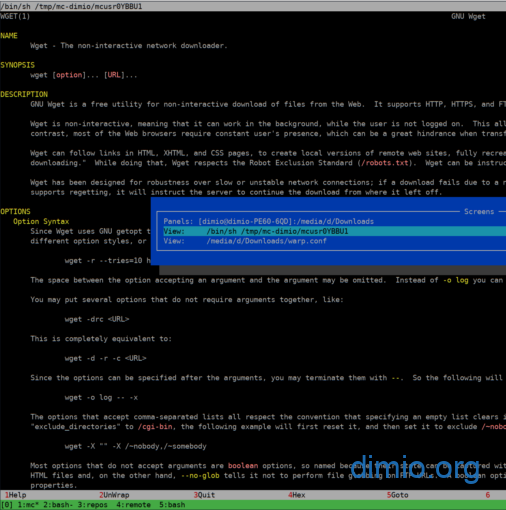 На «вкладке экранов» содержится список файлов, открытых через MC на просмотр/редактирование (при использовании mcedit). На примере ниже — для просмотра открыты man wget и текстовый конфиг. Между «экранами» можно переключаться без выхода из режима просмотра/редактирования.